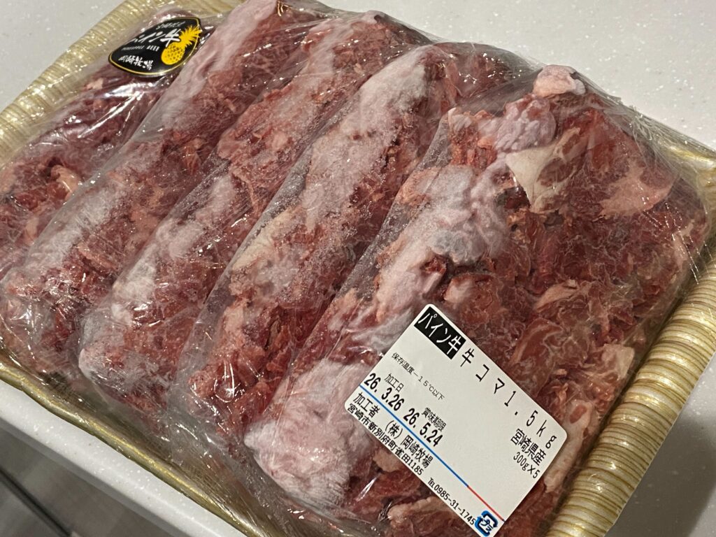 今回ご紹介する返礼品は、パイン牛の牛コマ切れ1.5kg(300g×5パック)。